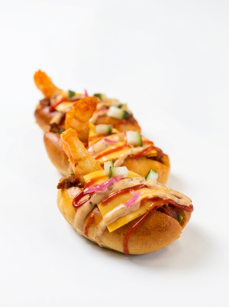 Mini pain à hot dog maison, sauce Foodies, brunoise de cornichons, cheddar, ketchup