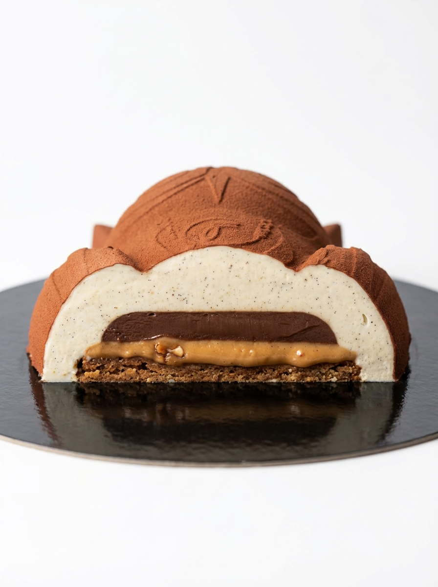 Biscuit brownie fondant, praliné cacahuète croustillant, caramel au beurre salé et cacahuètes grillées, crémeux chocolat noir Valrhona, mousse vanille de Papouasie