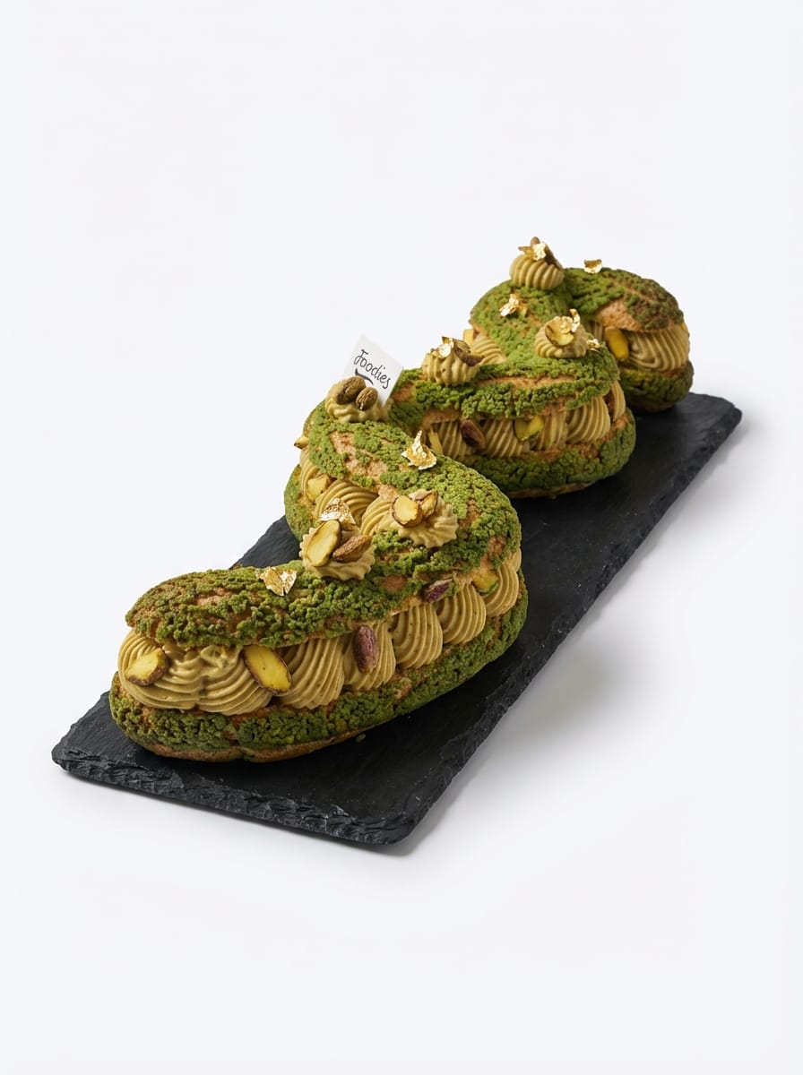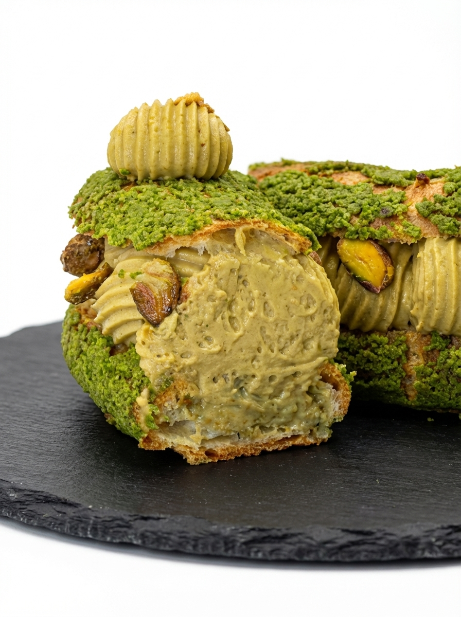 Pâte a choux, craquelin pistache ultra croustillante façon chocolat de Dubaï, pistache caramélisée et mousseline à la pistache