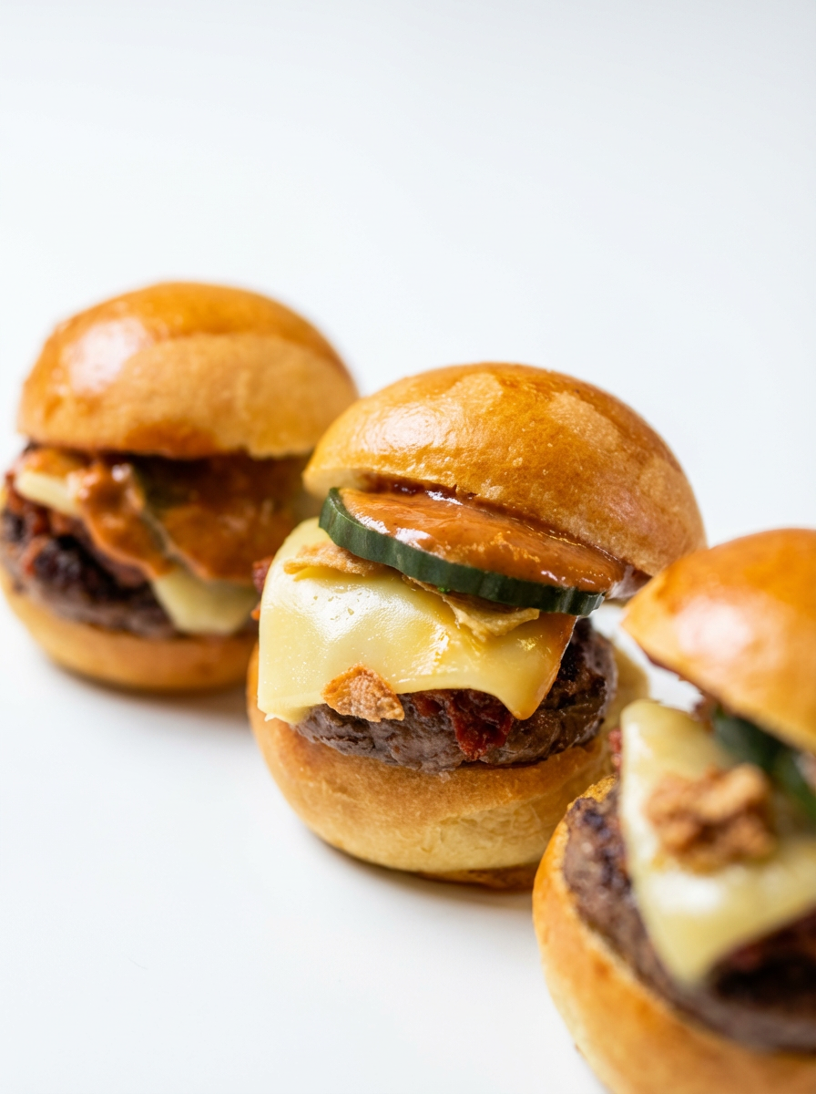 Bœuf et canard braisés, relish d’oignions, courge châtaignes, pickles de courges, pickles d’oignions rouges, Comte 12 mois, sauce Albufera a dipper